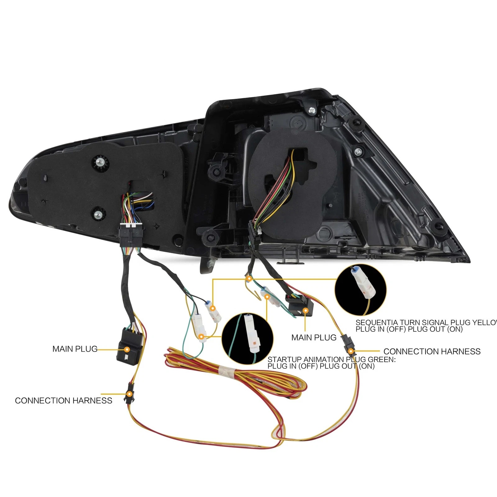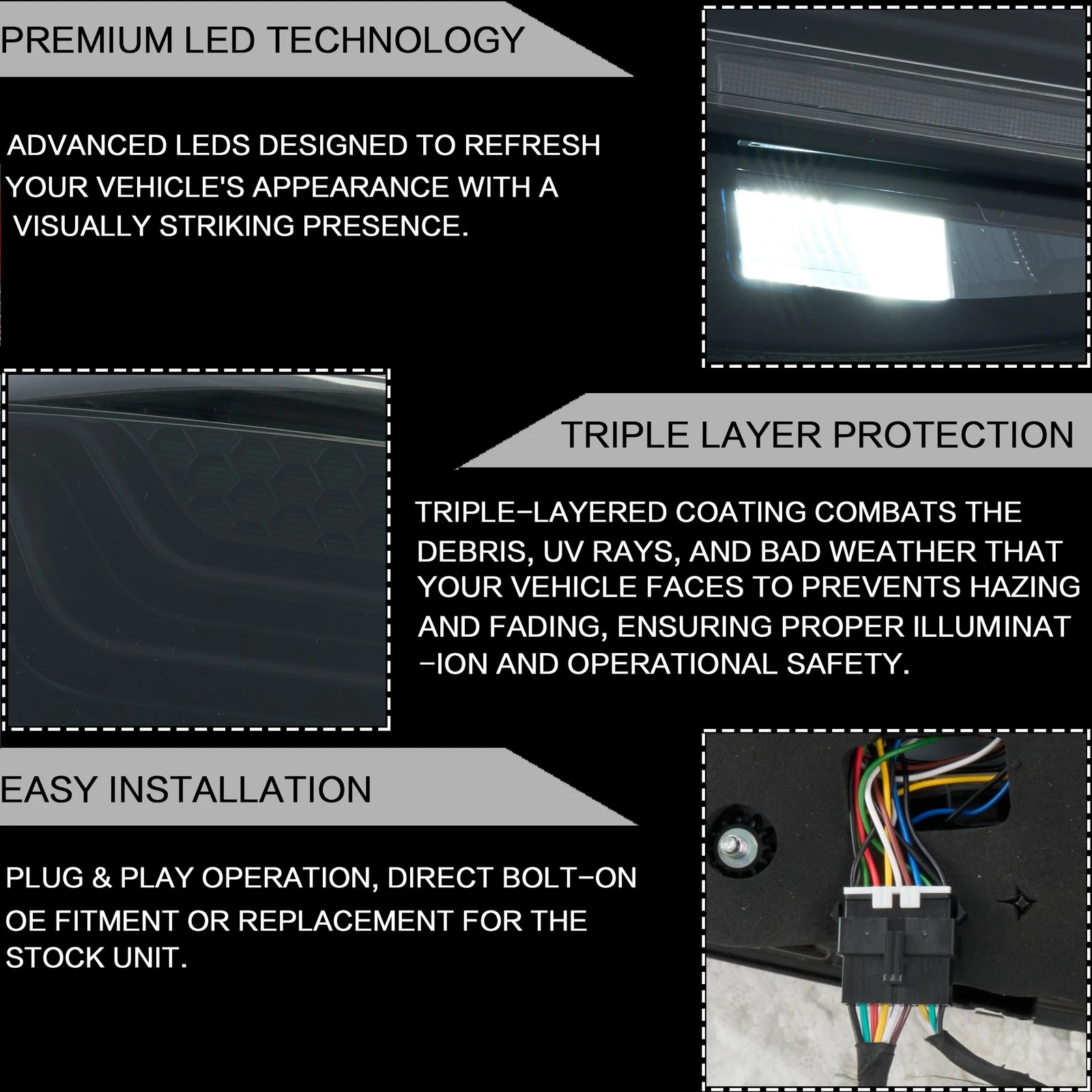 Item Features:Lens Color: Smoked, RedRunning Light: LED (Red)Turn Signals: LED (Amber.With Sequential Turn Signal)Brake Light: LED (Red)Reverse Light: LED (Diamond White)Fog Light: LED (Red)
